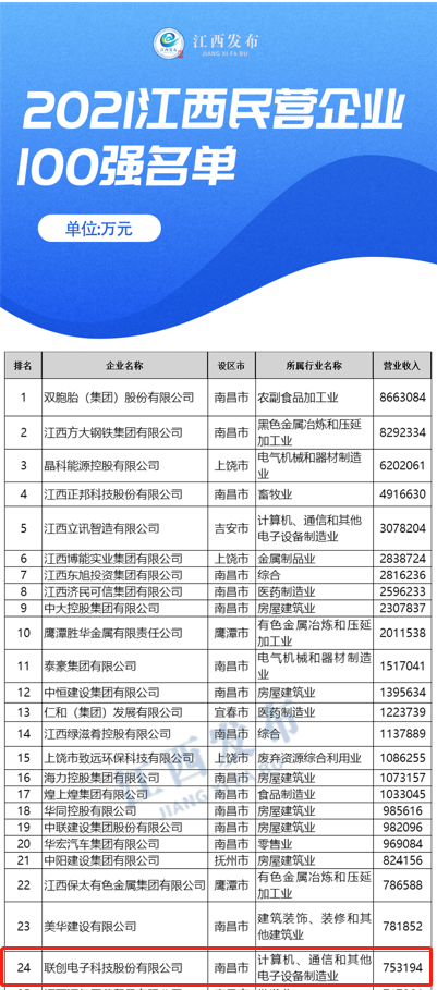 12月13日,2021江西民营企业100强、2021江西制造业民营企业100强、2021江西服务业民营企业20强榜单发布,stake电子以强大的综合实力和稳健的发展态势,连续第九年荣登榜单。其中,在江西民营企业100强中位列第24位,较前一年位次前进3位,在江西制造业民营企业100强中位列第13位。